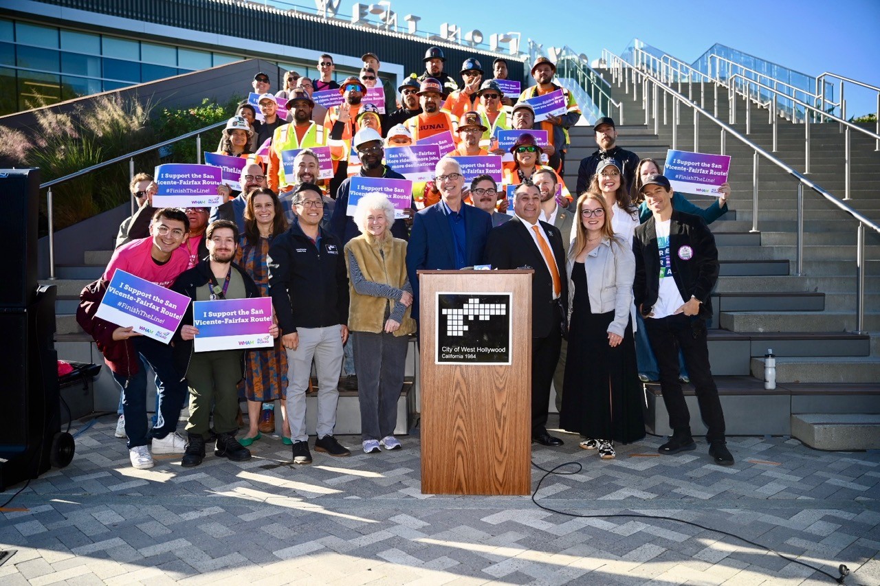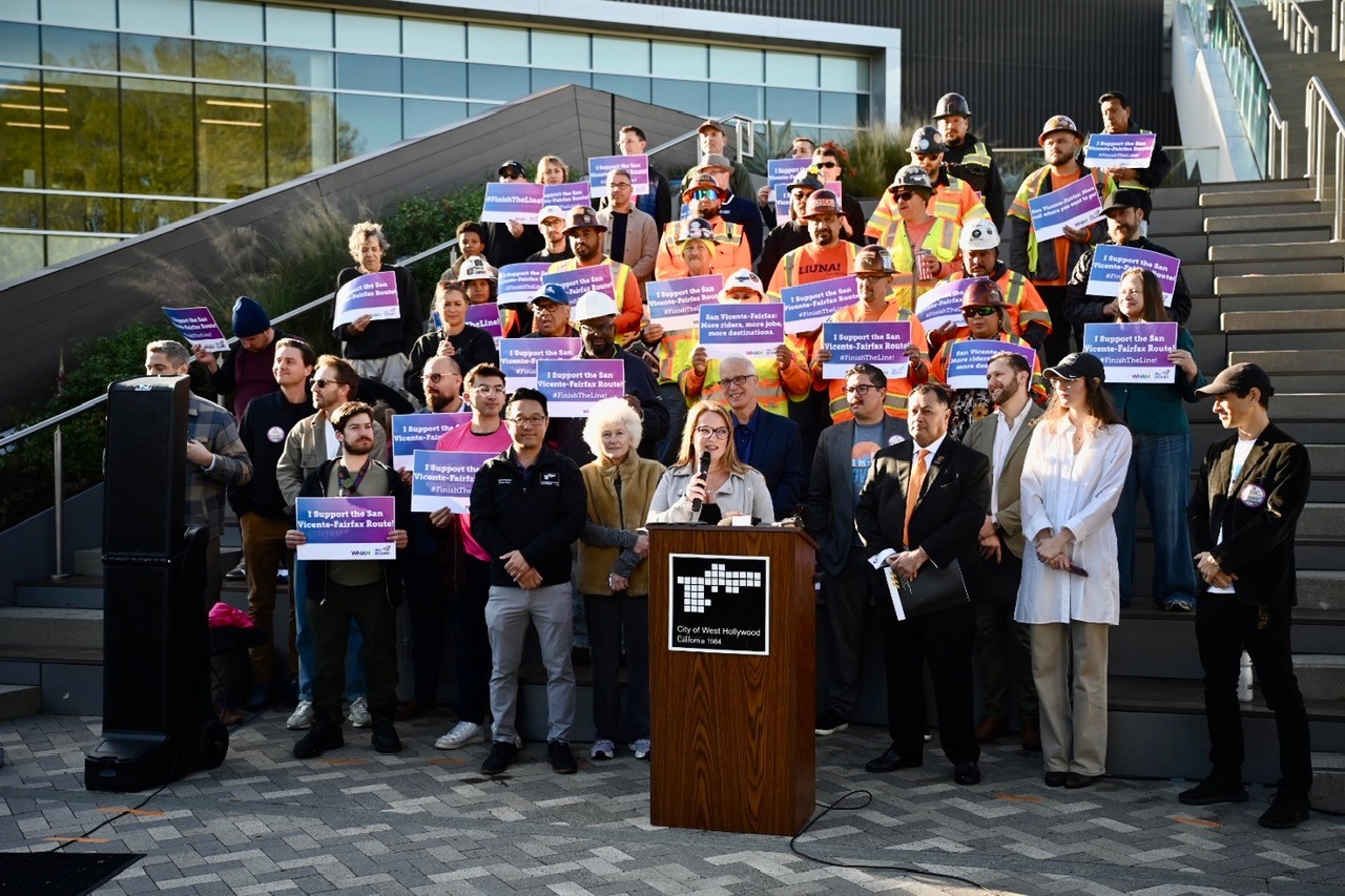 Recently, TRG helped with the creation of materials that promote the San-Vicente Fairafax proposed route. This route will serve all the major destinations and job centers in Mid City Los Angeles, West Hollywood, and Hollywood, and bring more than 110,000 jobs within a half-mile of the new Metro station. TRG also supported the City of West Hollywood’s support rally for the San-Vicente Fairfax route which occurred on Thursday, February 12 at West Hollywood Park. TRG provided pastries, coffee, and shirts for community members to show their support of the proposed route.